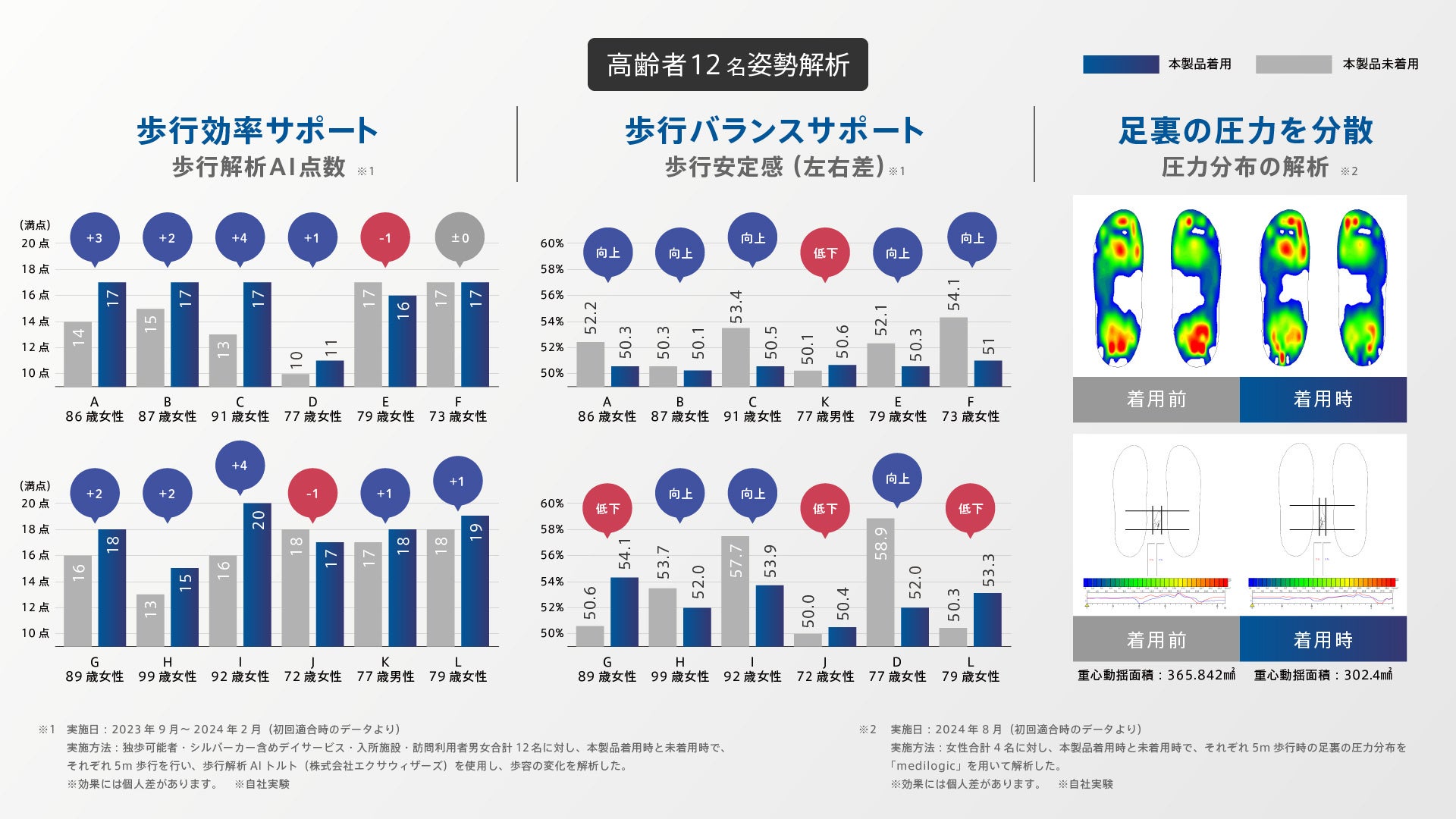 実施日:2023年9月~2024年2月 実施方法:デイサービス・入所施設・訪問利用者の70~90代の男女12名(シルバーカー使用者含む)に対し、本製品着用時と未着用時で、それぞれ5m歩行を行い、歩行解析AIを使用し歩行姿勢の変化を解析した。歩幅、歩行速度、左右差、歩行リズムなどから算出される総合得点は最大4ポイント、平均1.5ポイント向上。歩行時の左右差は約67%の方で良好に変化。