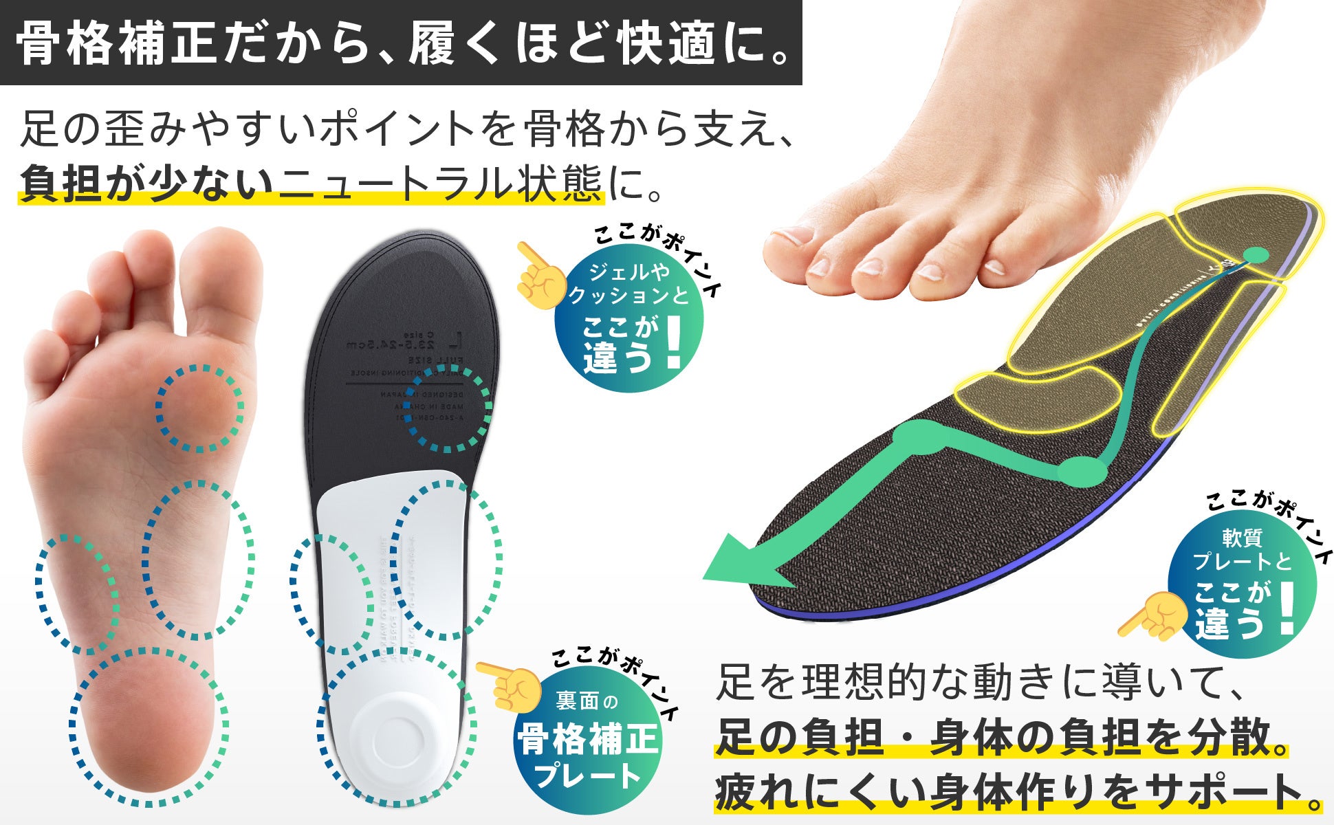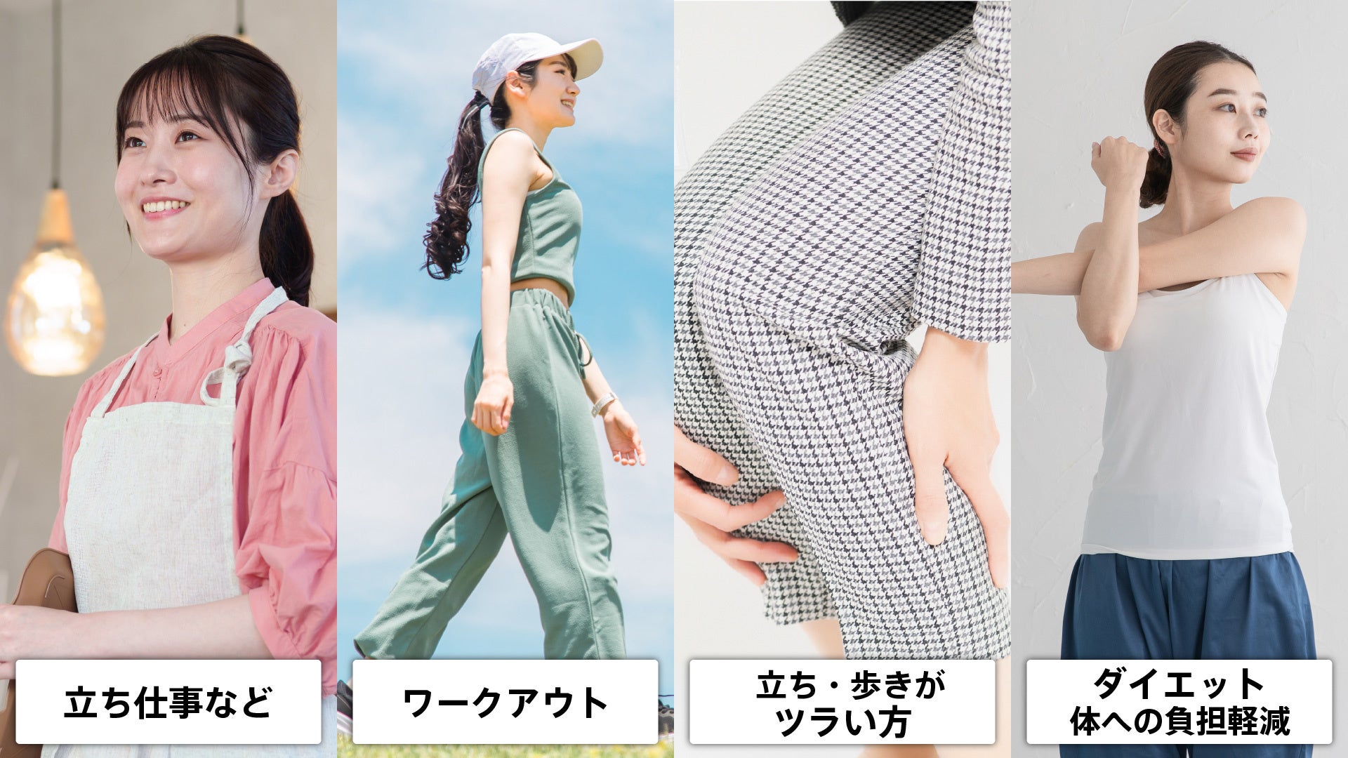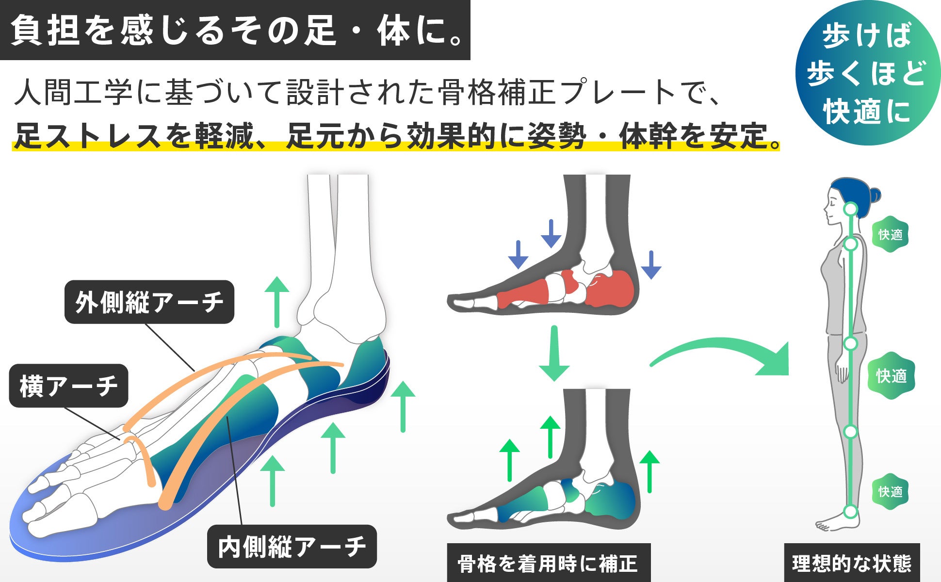 • 足ストレスを軽減:足の負担軽減、疲れにくい体作りをサポート。着用時の骨格補正による新しいアプローチ。