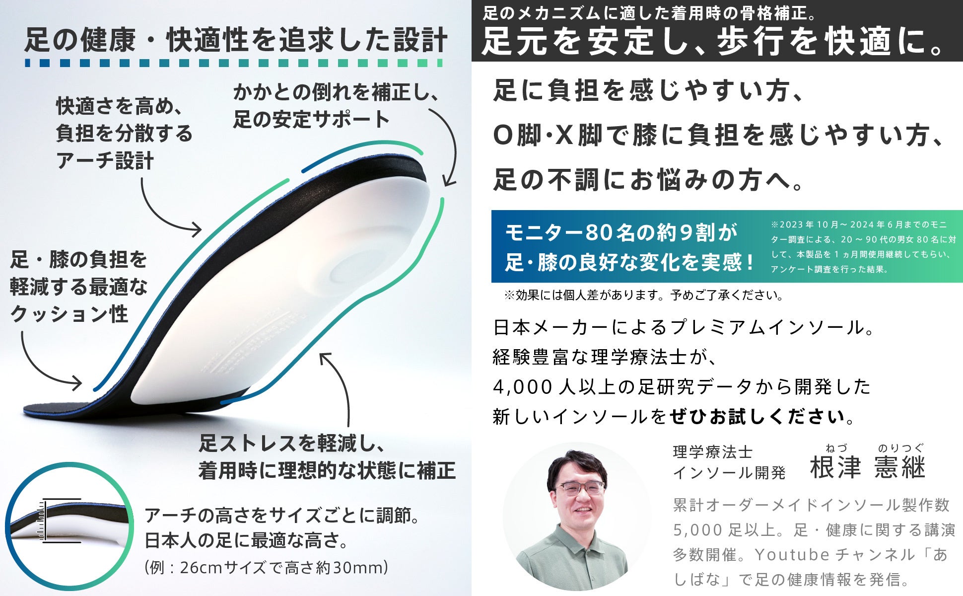 本インソール(中敷き)は足の負担を軽減し、日常生活や仕事における立つ・歩く・走る動作の快適性を大幅に向上させることを目指したインソールです。医学的・人間工学的な知見を活用し、着用時の足の骨格補正を行う新しいアプローチによって、これまでのインソールより大幅に快適性・機能性を向上し、足の健康維持をサポートします。