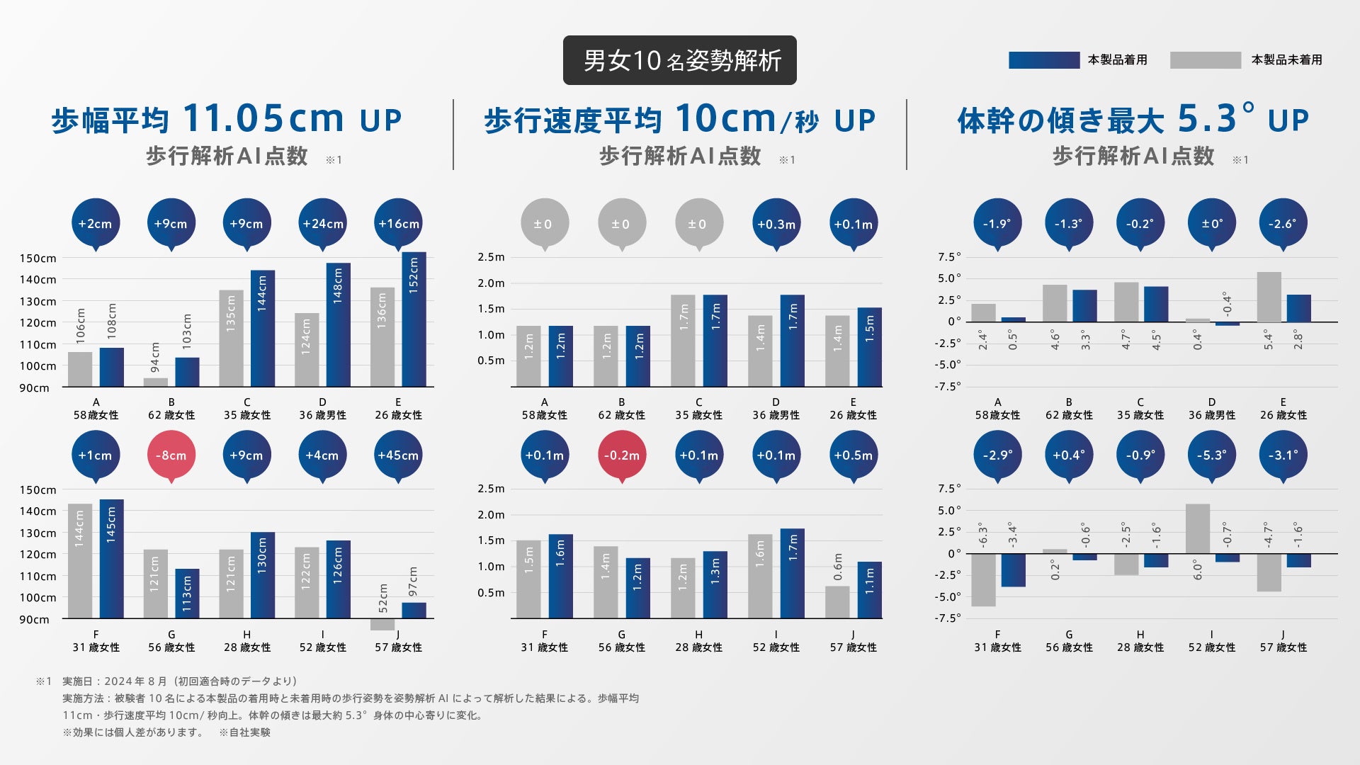 実施日:2024年8月 実施方法:20~60代の男女10名による本製品の着用時と未着用時の歩行姿勢を姿勢解析AIによって解析した結果による。歩幅平均約11cm、歩行速度平均10cm/秒向上。体幹の傾きは最大約5.3°身体の中心寄りに変化。