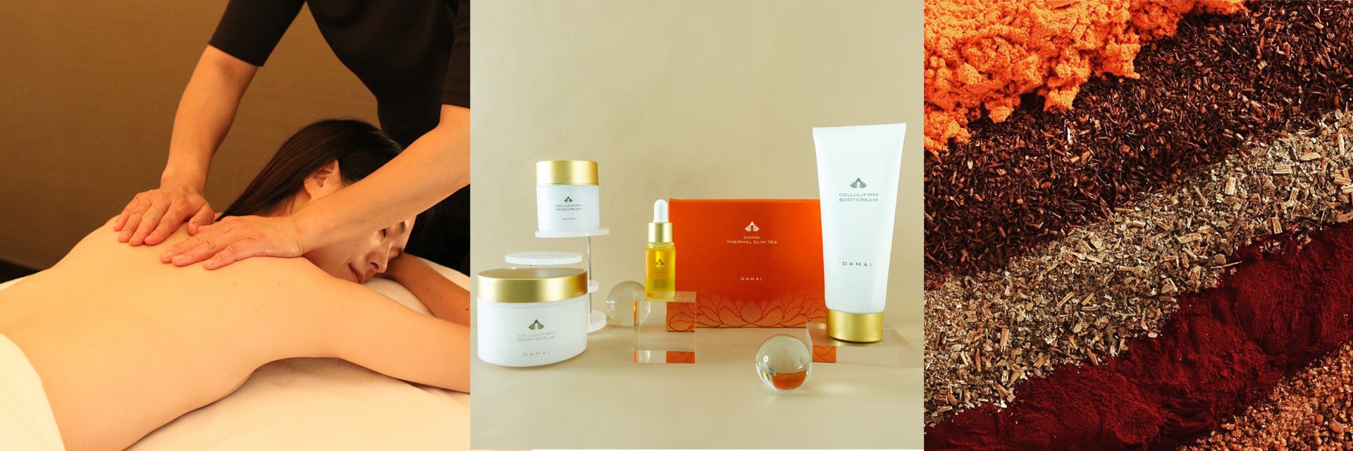 2012年より身体の不調の根本は“冷え”にあると提唱し、温活の先駆け的な存在である「スパ ダマイ」は、2015年よりホームケア製品の販売を開始。カラダの内側も外側もしっかりと温めるプロ仕様のホームケア製品を開発しています。実際にスパの施術でも使用しており、バニラビーンズ由来の温感成分バニリルブチルを配合したボディクリームや、ブラックジンジャーや生姜麹の入ったハーブティーは、温活製品の中でアイコニックな存在。全てのダマイ製品に<温め・巡り・排出>を促すダマイ独自のオリジナルのメソッド“サーマル フィト セラピー”と“サーマルドレナージュ”が踏襲されています。