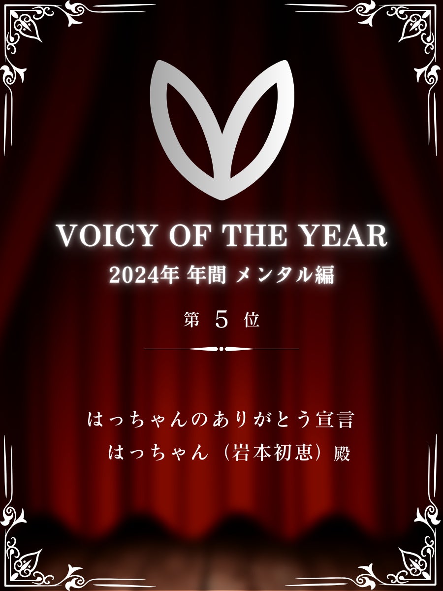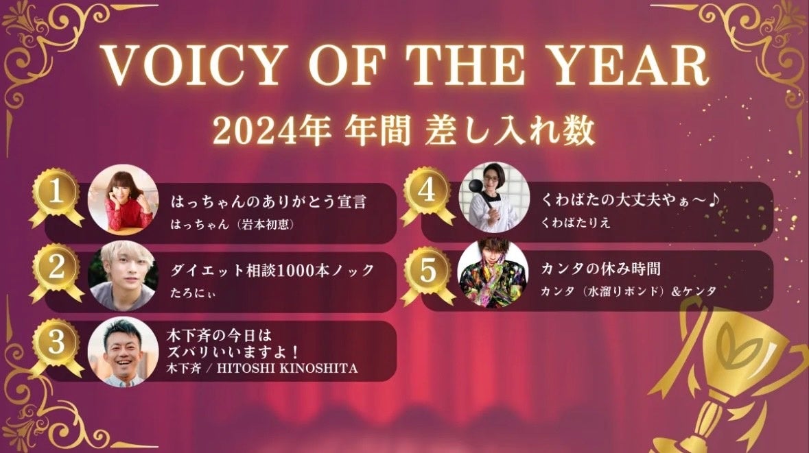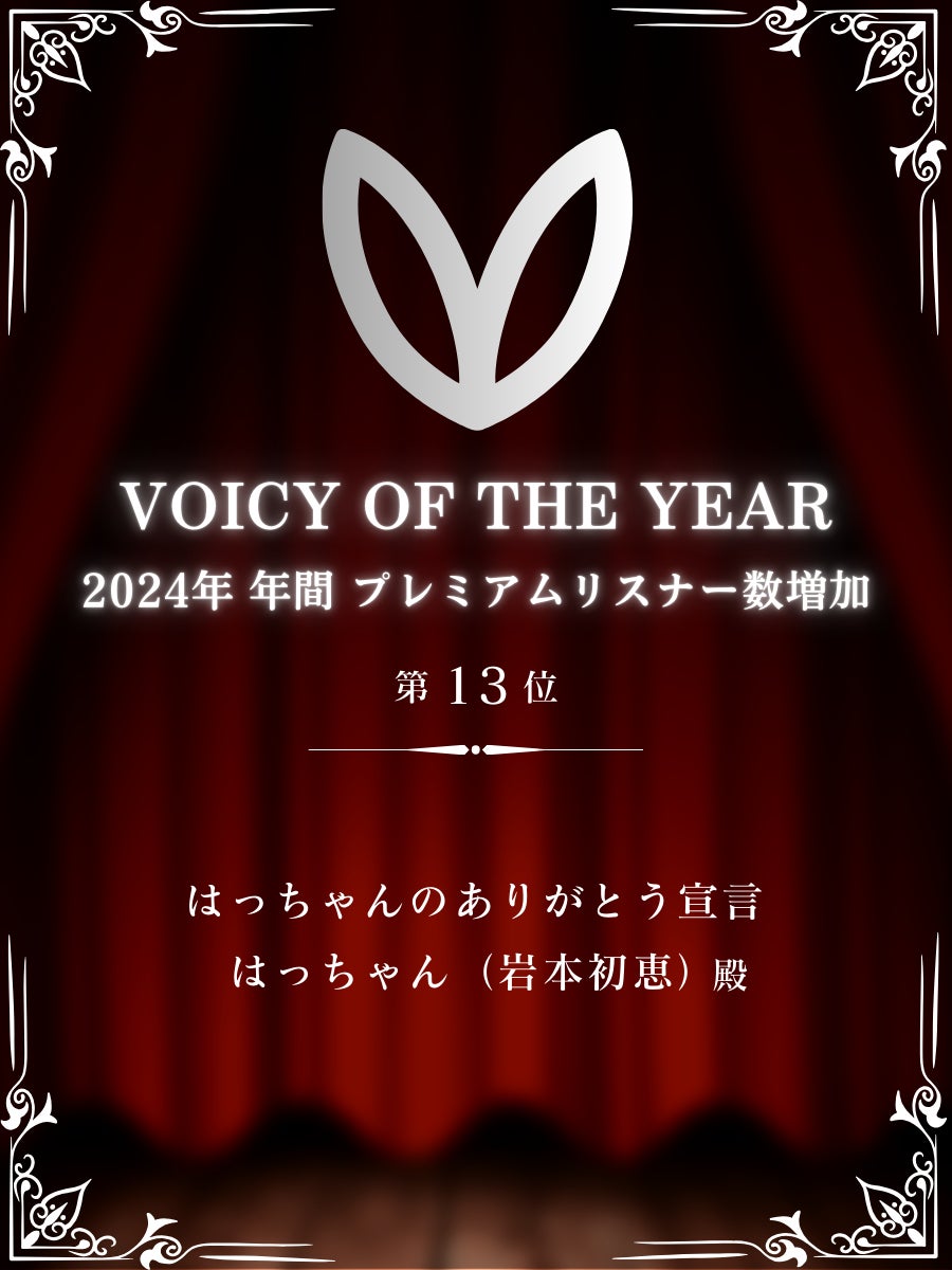 Voicyで多くの著名な皆様が配信される中での「差し入れ数」年間1位獲得は、はっちゃんの発信内容に対する多くのリスナー様からのサポートの証です。