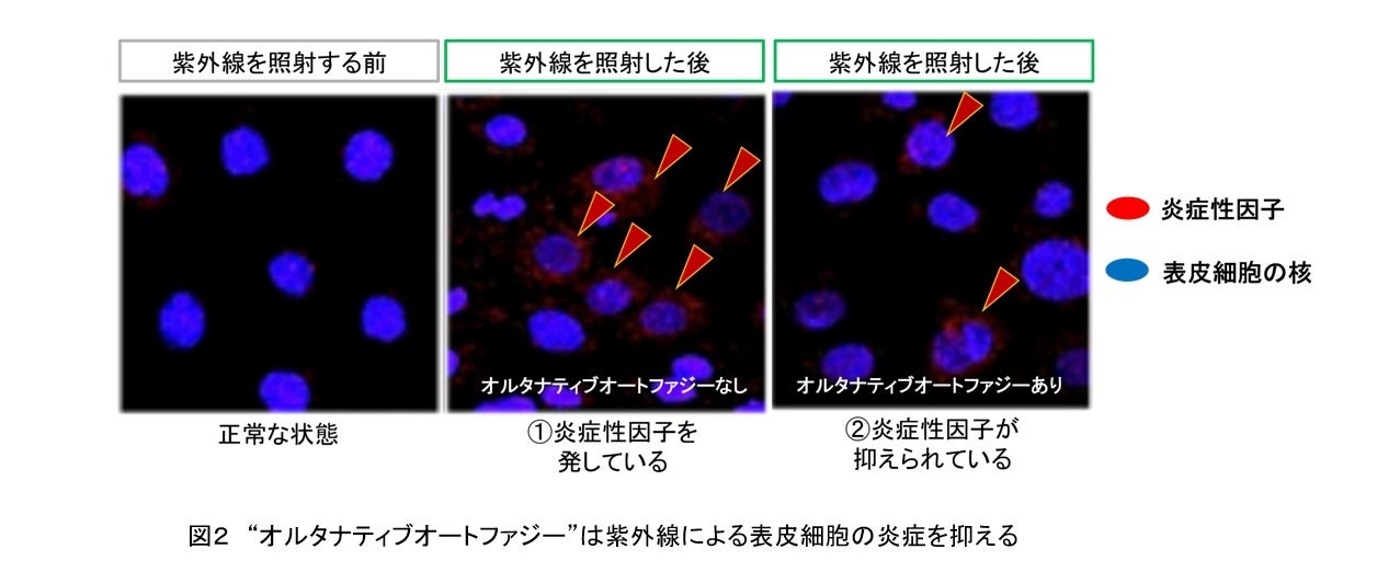 はじめに、表皮細胞に紫外線(UVB)を照射すると、表皮細胞内のミトコンドリアが損傷することが分かりました。また紫外線により損傷したミトコンドリアの周辺では、炎症を指令するたんぱく質集団であるインフラマソームが活性化し、炎症性因子を発していることを確認しました(図2-①)。次に”オルタナティブオートファジー”を活性化させると、炎症性因子が抑えられることが分かりました(図2-②)。”オルタナティブオートファジー”が働くことで、損傷したミトコンドリアが分解され、それに伴い細胞の炎症も抑えられたと考えられます。