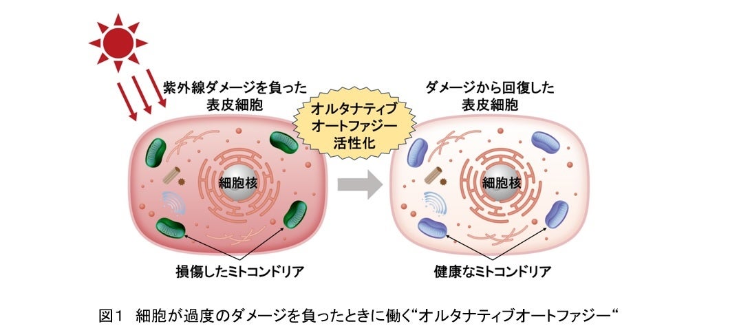 ”オルタナティブオートファジー”は、2009年に東京科学大学(旧 東京医科歯科大学)総合研究院 高等研究府プロジェクト研究部門 病態細胞生物学研究室の清水教授によって発見され”第二のオートファジー”とも呼ばれます。紫外線などが原因で細胞が過度なダメージを受けた際に働き、損傷したミトコンドリア※2 など細胞内の不要物を壊し再構築する仕組みで、通常のオートファジーとは異なります。これまでに”オルタナティブオートファジー”が肌の健康維持に関連していることは分かっていましたが、当社との共同研究で、新たに紫外線による肌の光老化を抑制する働きがあることを解明しました。
