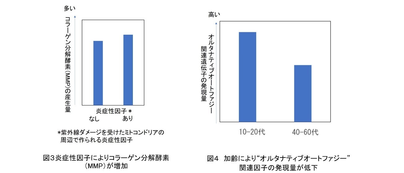 ”オルタナティブオートファジー”が働かずに炎症性因子が表皮細胞の外に放出され、その影響が真皮細胞に及ぶようになると、コラーゲン分解酵素(MMP)の発現が高まることが分かりました(図3)。つまり、”オルタナティブオートファジー”が働かない肌は真皮コラーゲンの分解が進み、光老化へ繋がってしまう可能性があります。また”オルタナティブオートファジー”は、加齢で機能低下する可能性があることも分かりました(図4)。