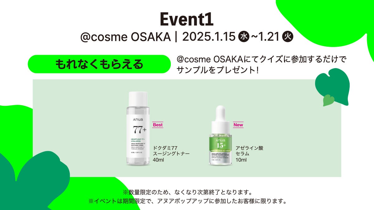 @cosme OSAKAにて韓国のスキンケアブランド「Anua(アヌア)」 のポップアップストアを2025年1月15日(水)~1月21日(火)の期間限定でオープンいたします。