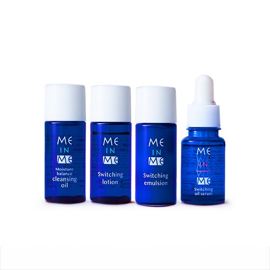 ●ミーインミー モイスチャーバランスクレンジングオイル、スイッチングローション、スイッチングエマルジョンのミニサイズ、スイッチングオイルセラム(静寂・本品)を体感できるトライアルセットです。