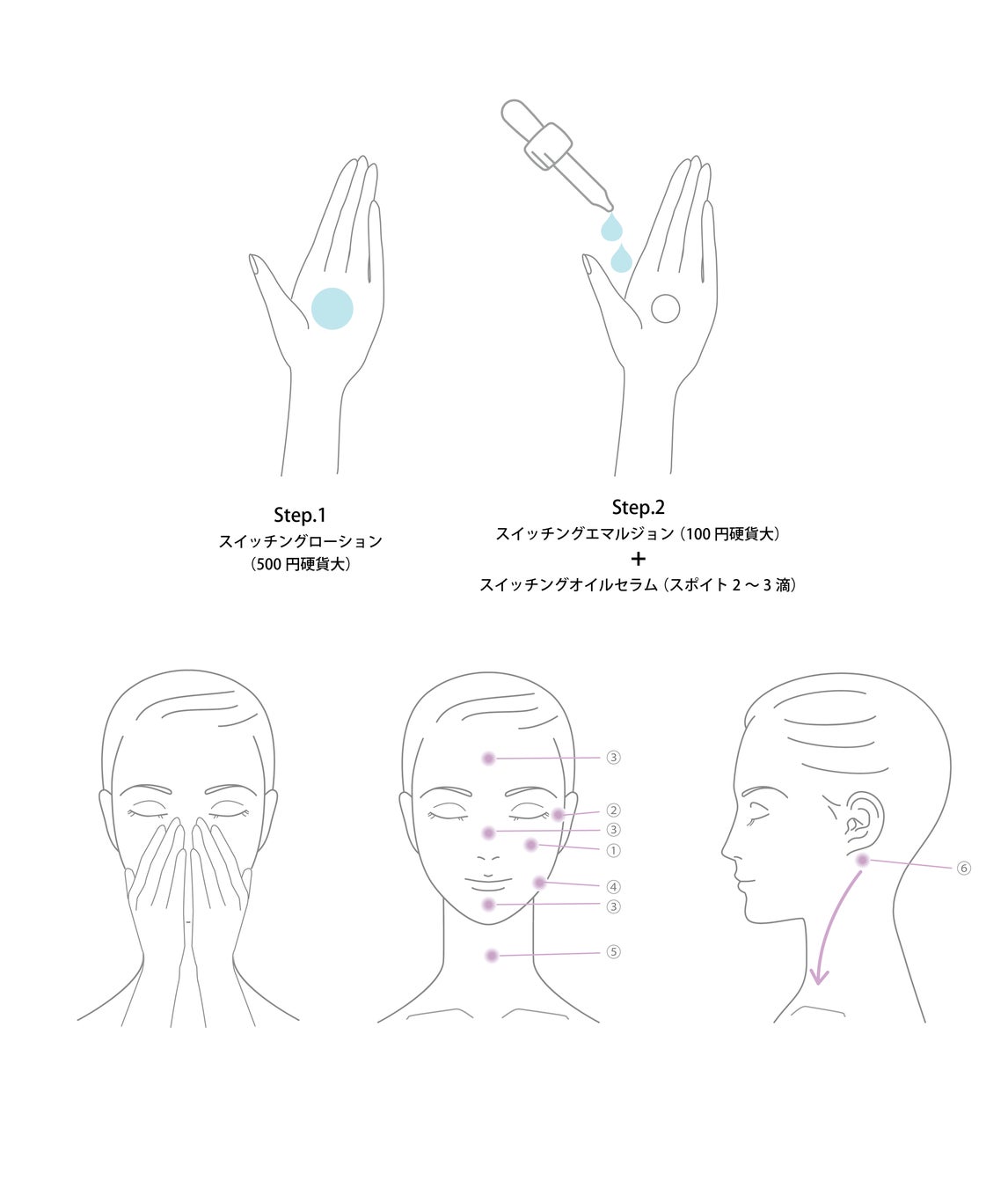 ●手のひらに化粧料をとり、香りを感じながら深呼吸をし、乾燥が気になりやすい頬や目もとから順番に、両方の手のひらで肌を軽く押さえるように顔全体になじませます。