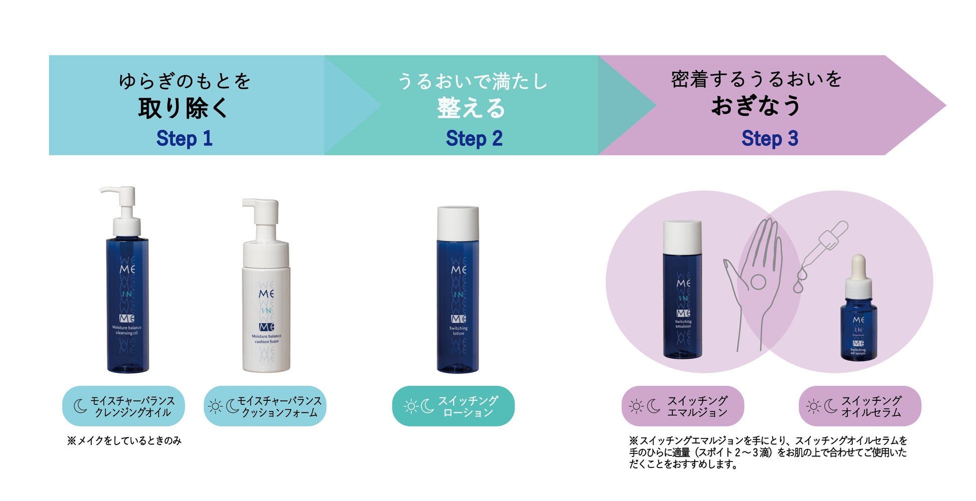 そこでミーインミーは、肌の健康を恒常的に保つために、角層が常にうるおいで満たされていること、肌のモイスチャーバランスが保たれていることをかなえる「3つの働き」を商品に取り入れ、ミーインミー が目指す「自分の軸を持つ美しさ」を体現できるうるおいを提供します。