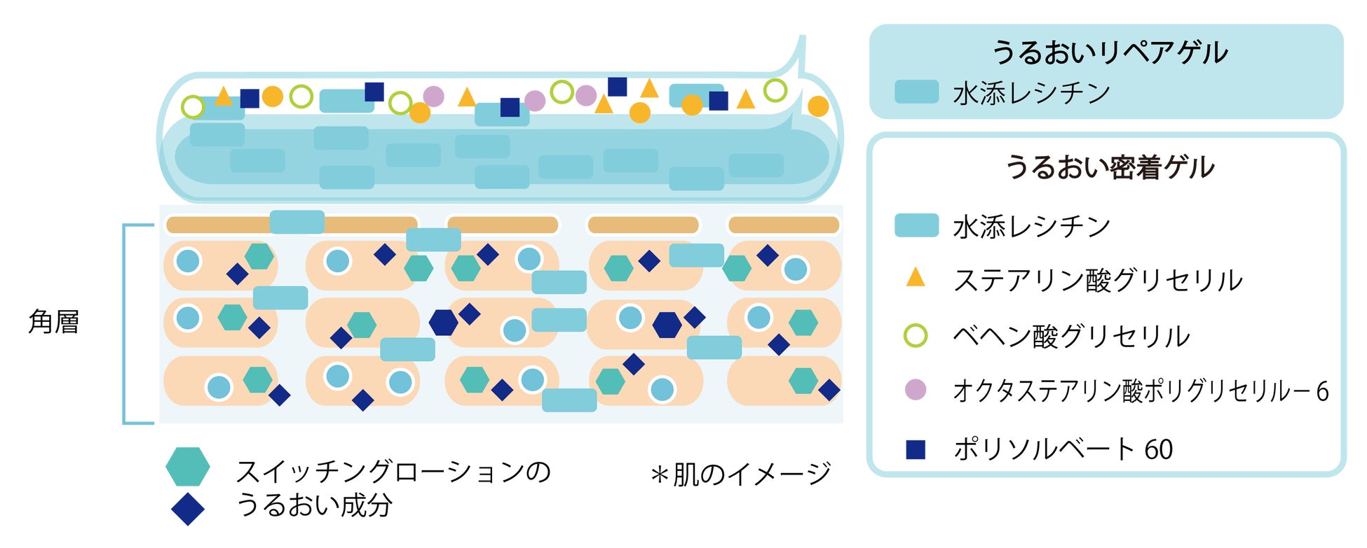 ●うるおいリペアゲル※13が化粧水などの水分を包みながら肌の軸※14まで素早くなじみ、肌をふっくらと弾ませます。