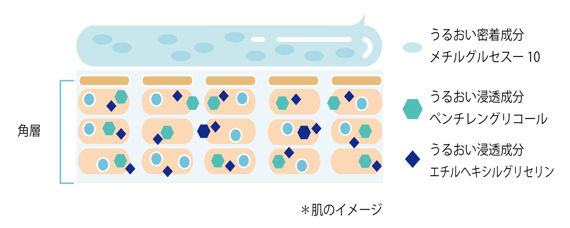 処方は、素早くうるおいを届ける、届けたうるおいを逃さない、うるおいを保ち続ける、スキンケアの基本を追求し、使用後の爽やかな肌感覚とうるおいが保たれる実効感にこだわりました。