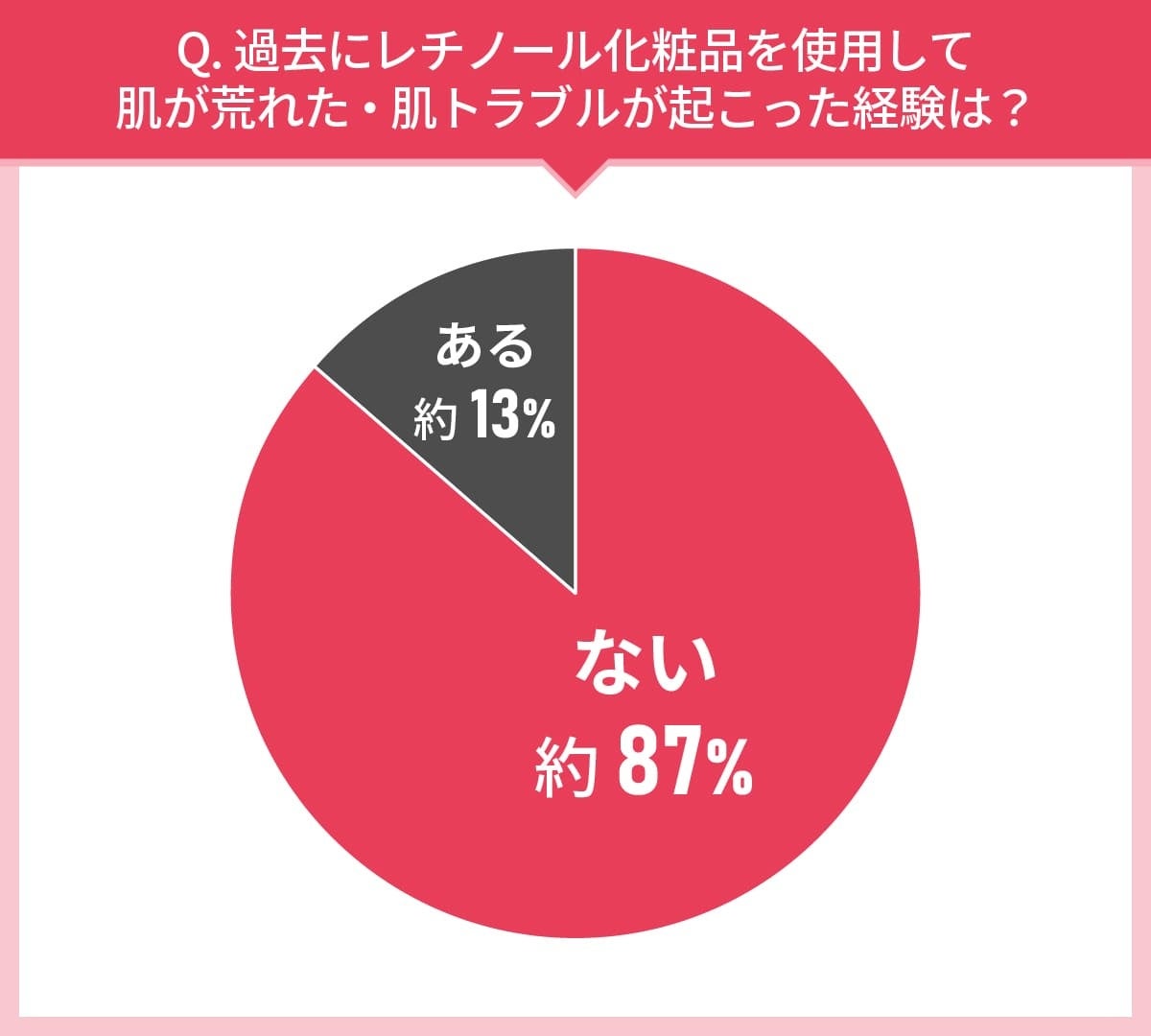 約87%の人が肌トラブルの経験はないと回答している一方で、約13%の人があると回答しました。少なからず合わないレチノール化粧品を使うと肌トラブルが起こる場合があるということですね。