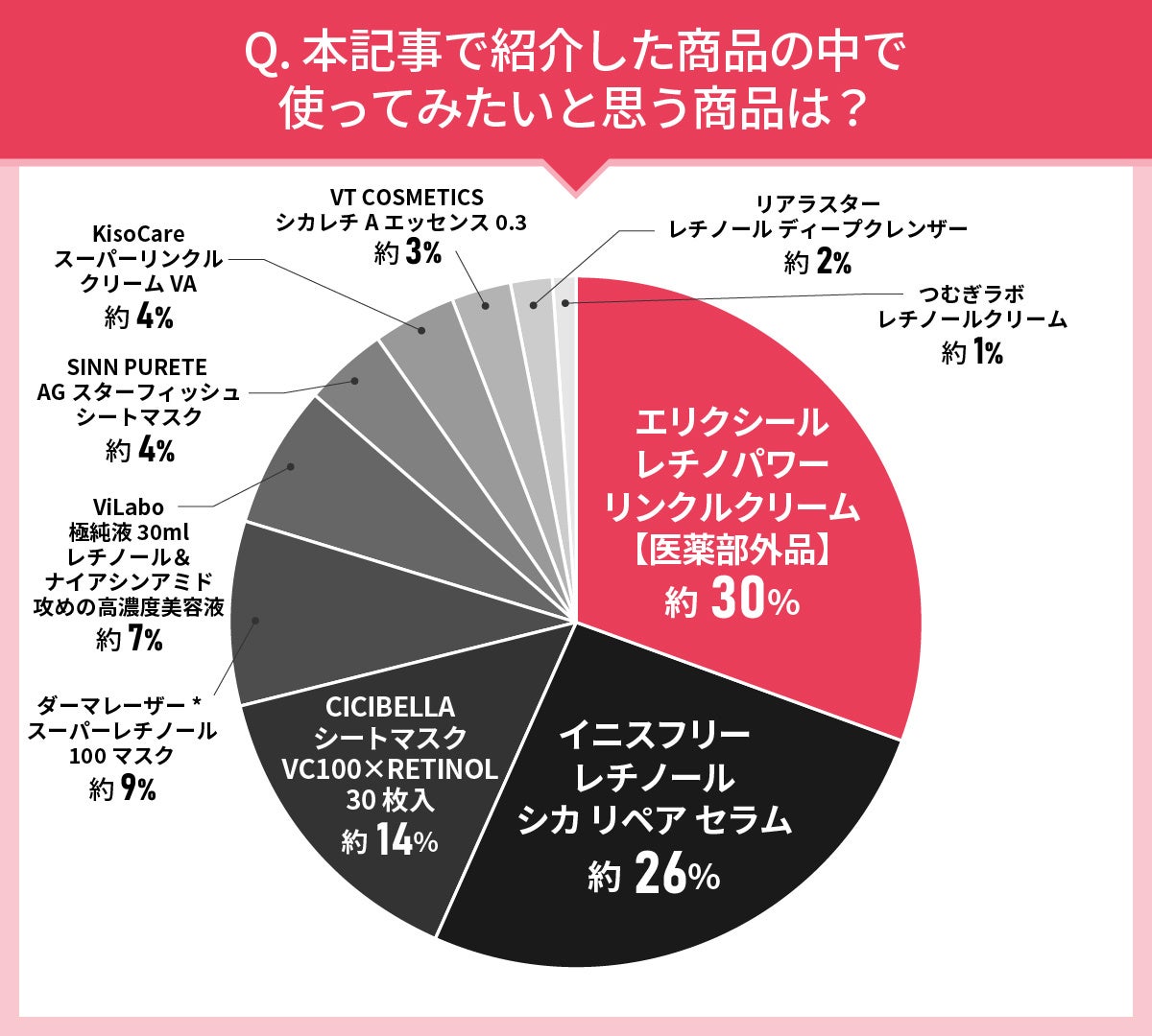 使ってみたい商品に関しては、医薬部外品の「エリクシール」がトップ。レチノールの効果に期待していることが伺えます。その他の商品では、「いつものケアをあまり変えなくてよい」「コスパがよい」など、使いやすさに魅力を感じたコメントが多い印象でした。