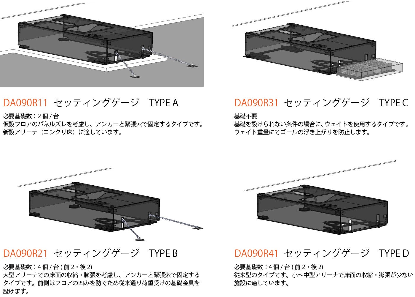 セッティングゲージを用いたゴールの固定方法について、アリーナのフロア状況に応じたベストなご提案。コンクリート上に設置されている仮設フロアなど新設アリーナに適しているタイプや、基礎を設けられない場合にも対応できる基礎不要のウェイトタイプなど、全4パターンのゴール固定方法があり、様々な大きさ、タイプの施設でも柔軟に対応いたします。 ※セッティングゲージについては別途お問い合わせください。