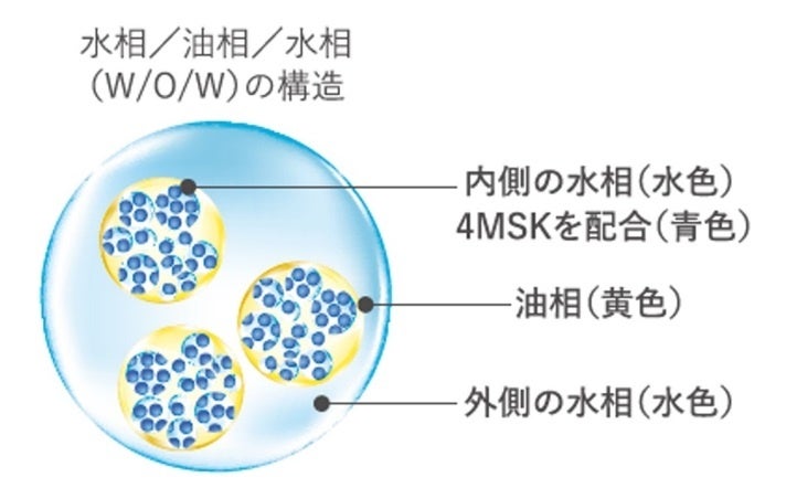 美白有効成分4MSKと水相/油相/水相(W/O/W)処方を組み合わせ、最内水相に4MSKを配合した処方