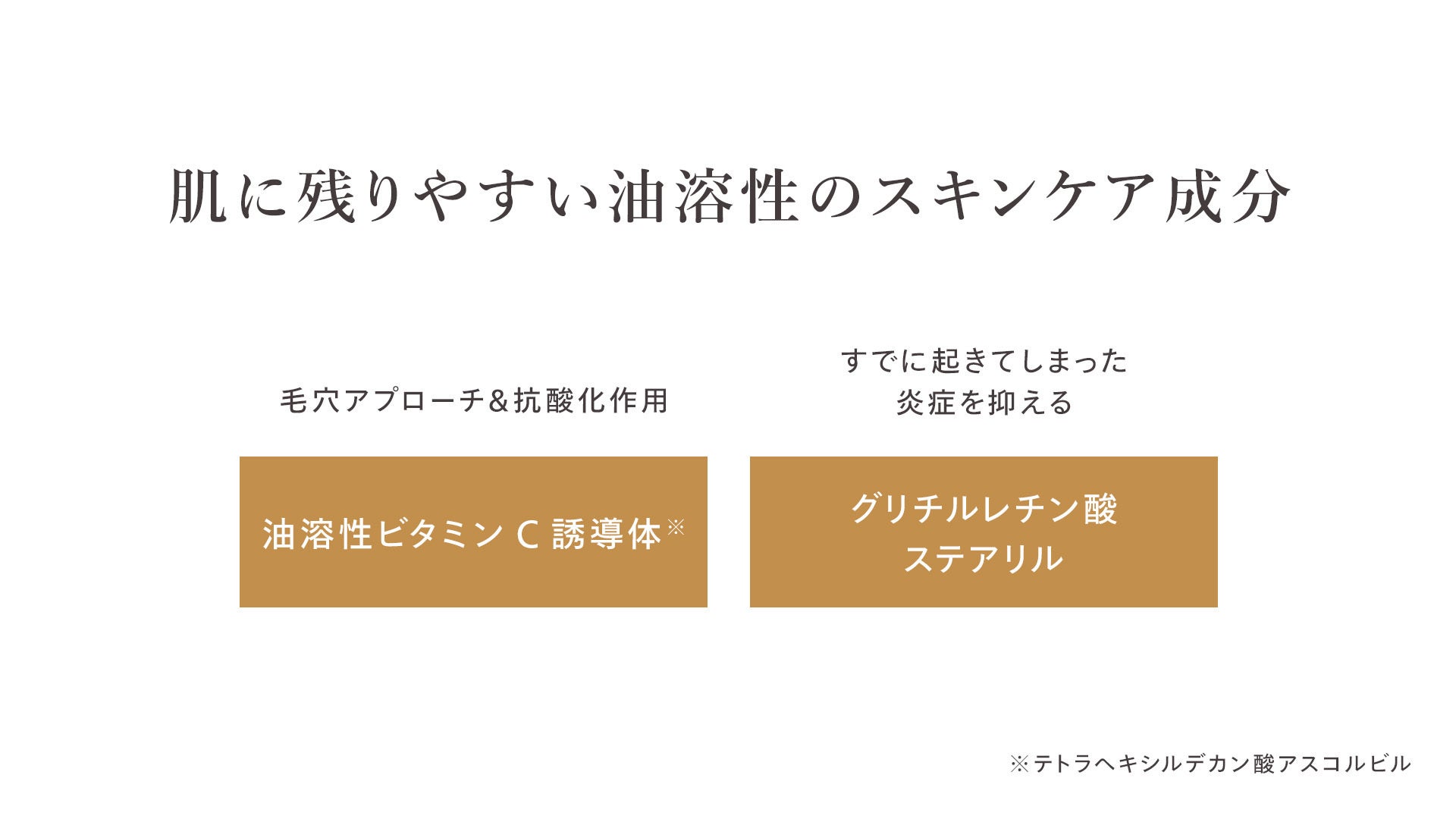 すでに受けてしまったダメージ※1をケアするため、ビタミンC誘導体※2、グリチルレチン酸ステアリル※3、2種類の油溶性スキンケア成分を配合しました。