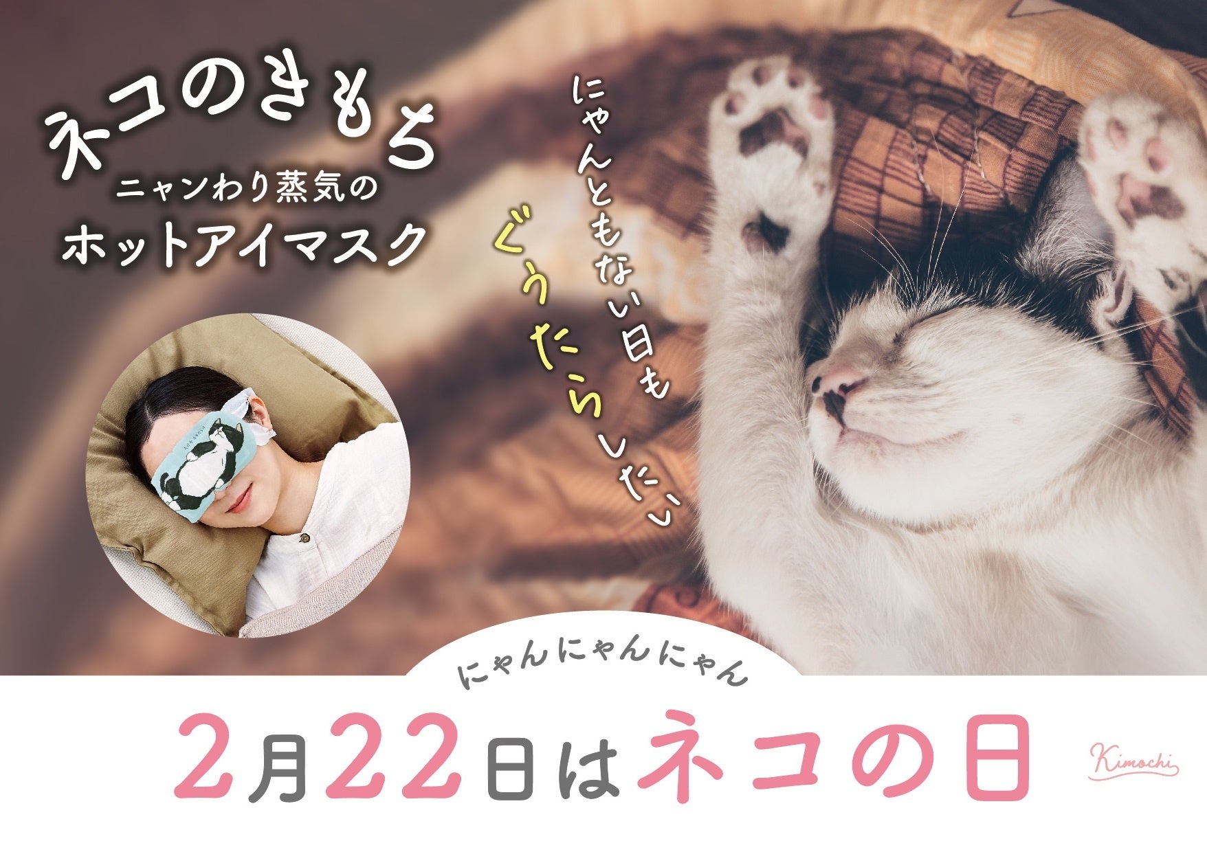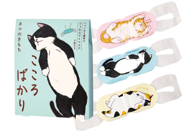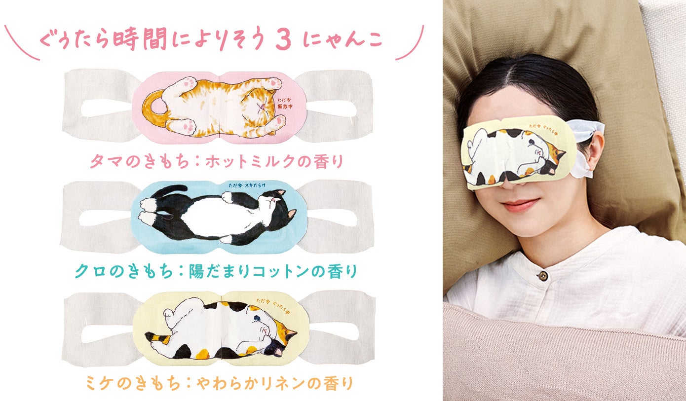 パッケージから取り出すと温かい蒸気が出て、目元をじんわり温めながら、やさしいアロマと “へそ天にゃんこ” に癒される『ネコのきもち』のホットアイマスク。