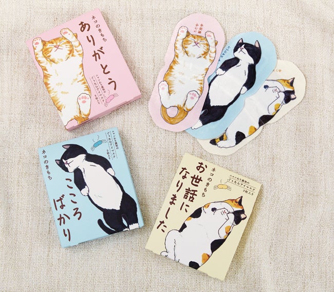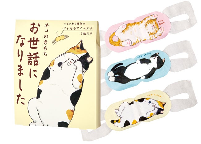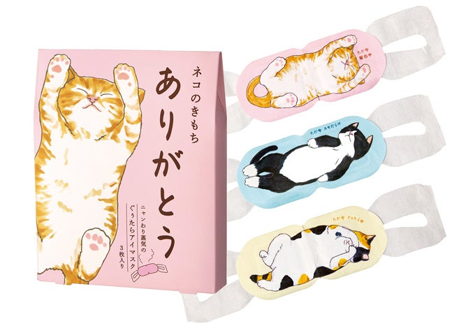「タマ/ありがとう」「クロ/こころばかり」「ミケ/お世話になりました」の3種のメッセージ付きパッケージが揃いました。リラックスモードのネコアイマスクで届けるいたわりギフトです。
