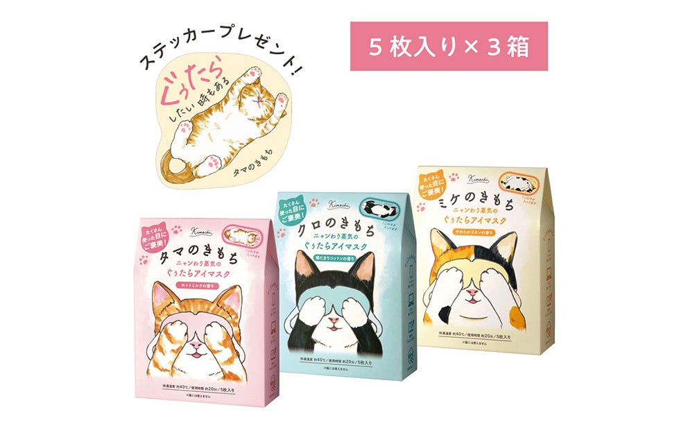 「ネコの日」にちなんで「ネコのきもち ホットアイマスク5枚入り」3種のお得なセットをご用意しました。数量限定で「タマのきもち オリジナルステッカー」をプレゼント!