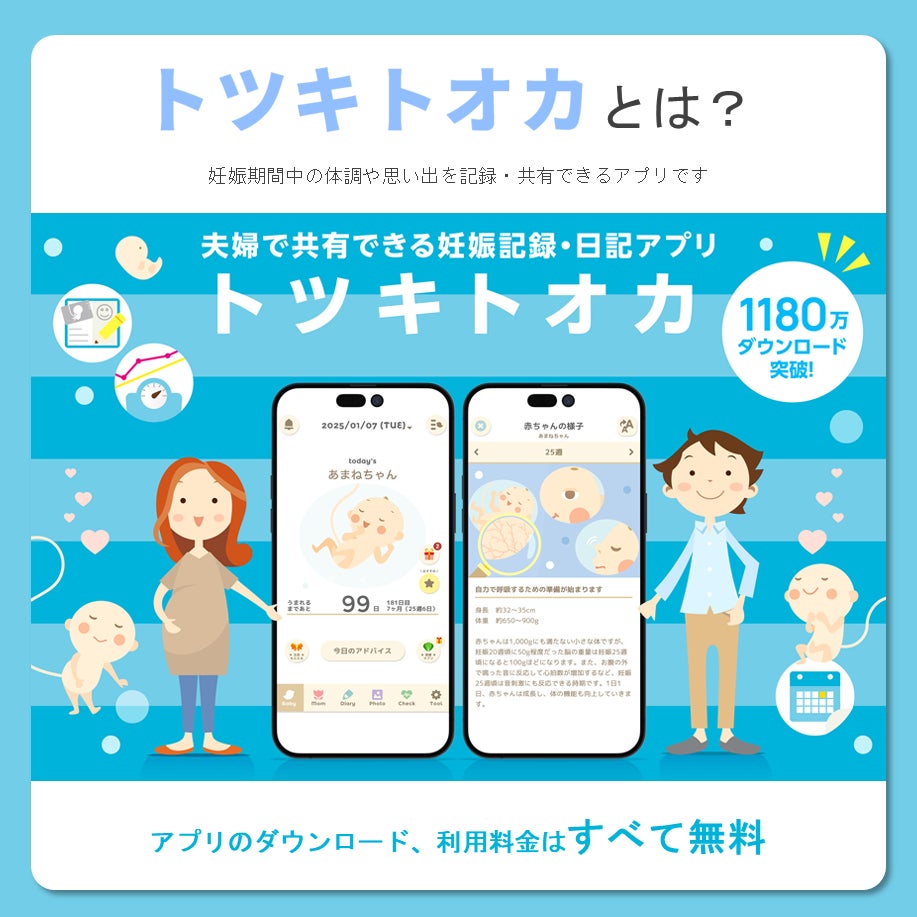 「トツキトオカ」は、総ダウンロード数約1180万件(2025年1月現在)、国内月間アクティブユーザー数約75万人(2025年1月現在)を誇る大人気の妊娠記録・日記アプリ。夫婦でアプリを連携することができ、お腹の赤ちゃんの様子やママの体調を共有しながら、 妊娠記録・日記を夫婦で一緒につくって楽しめるアプリです。