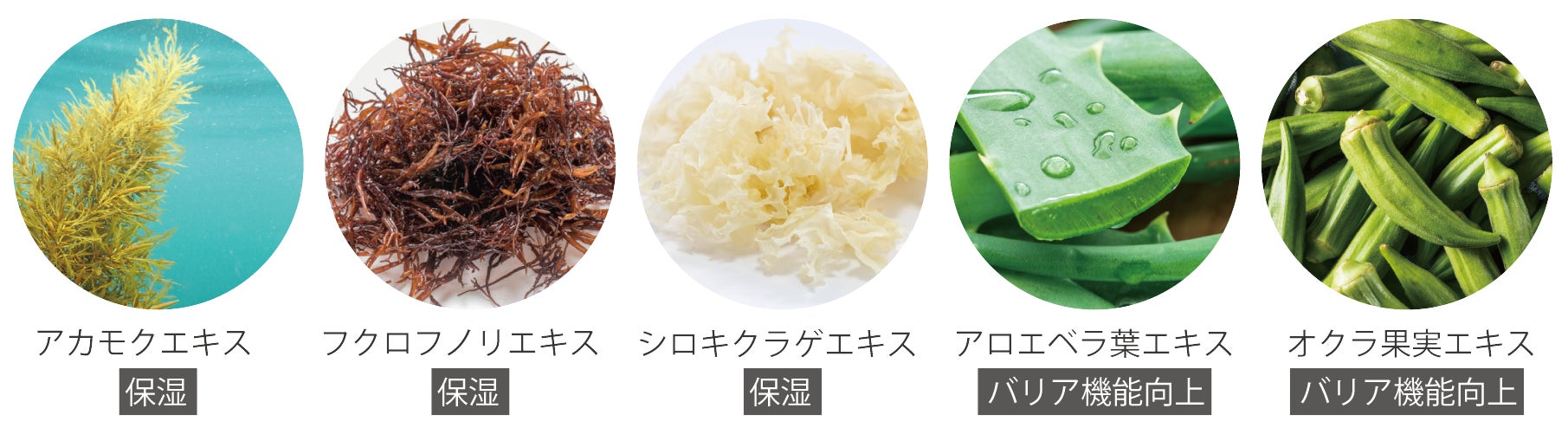 ■厳選した植物由来と海藻由来の成分を5種類配合。どれも保湿作用に優れた成分です。