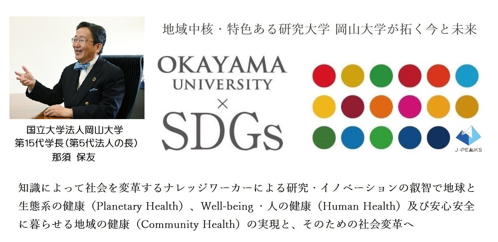 岡山大学 文部科学省「地域中核・特色ある研究大学強化促進事業(J-PEAKS)」に採択~地域と地球の未来を共創し、世界の革新の中核となる研究大学:岡山大学の実現を加速とともに世界に誇れる我が国の研究大学の山脈を築く~