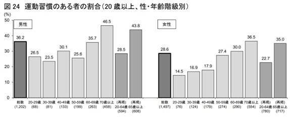 一方で、厚生労働省の令和5年国民健康・栄養調査によると、「1回30分以上の運動を週2回以上実施し、1年以上継続している者」は、40代女性で「17.9%」、50代女性は「27.4%」と低い。