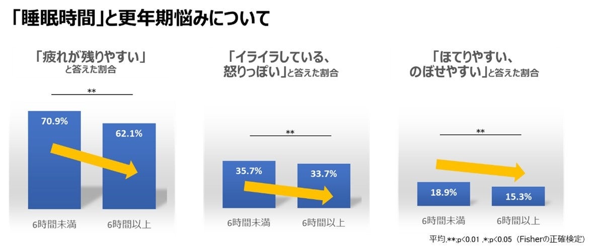 睡眠時間が「6時間以上」の人は、「6時間未満」の人と比較して、「疲れが残りやすい」「イライラしている、怒りっぽい」「ほてりやすい、のぼせやすい」と回答する割合が有意に低かった。