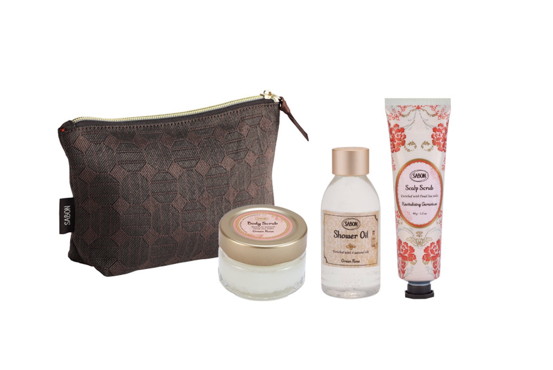 内容 「シャワーオイル グリーン・ローズ」(100mL)、「ボディスクラブ グリーン・ローズ」(60g)、「ヘッドスクラブ リプレニッシング」(90g)、ポーチ