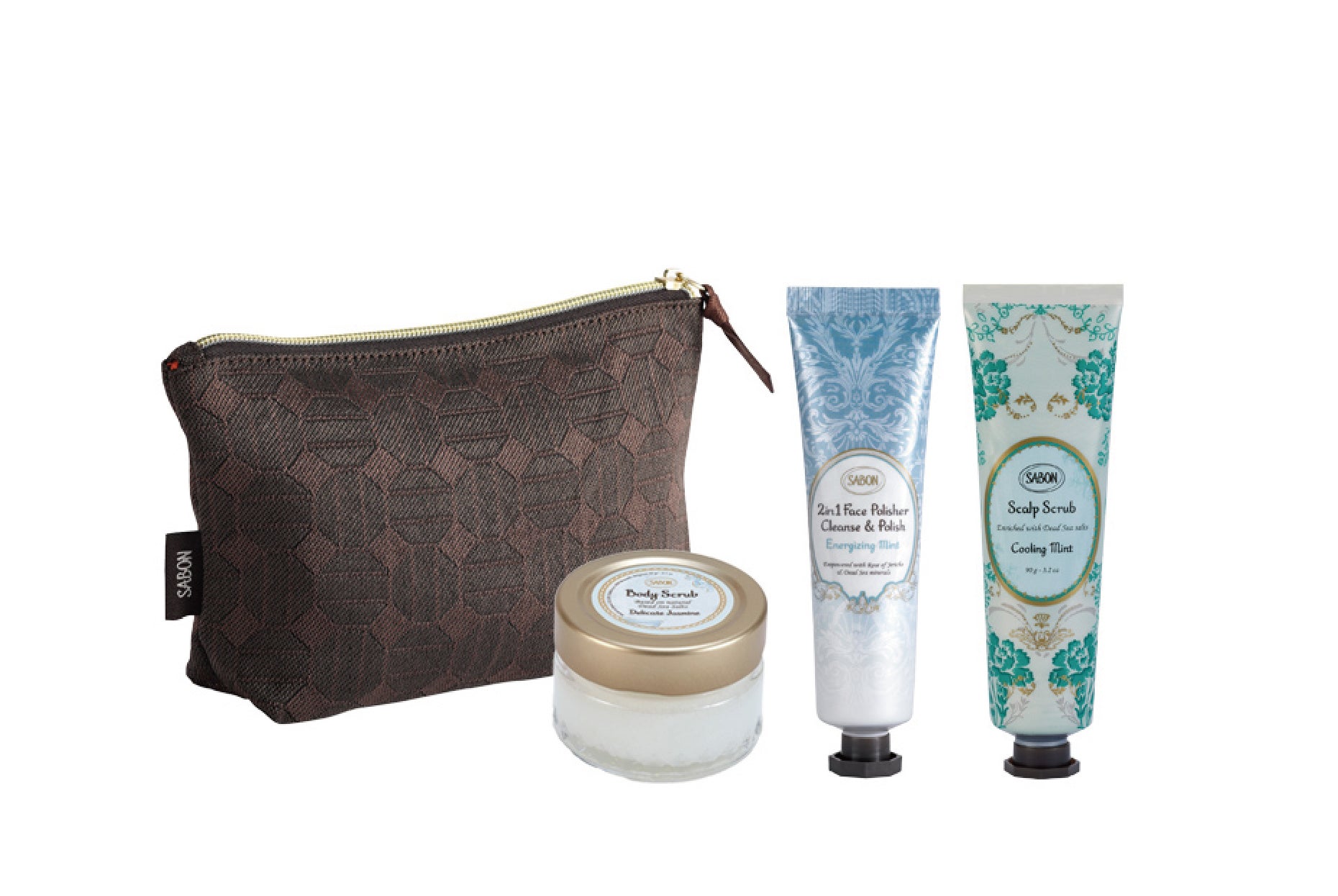 なめらかなつや肌に導く「ボディスクラブ」をはじめ、心地よい香りを楽しめる人気製品とオリジナルポーチがセットに。旅行、ジムなどでの使用やギフトにもおすすめです。