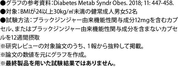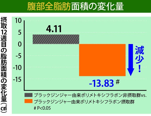 ブラックジンジャー由来ポリメトキシフラボンは、BMI24以上30Kg/㎡未満の方の内臓脂肪と皮下脂肪の面積を減らすことが報告されています。