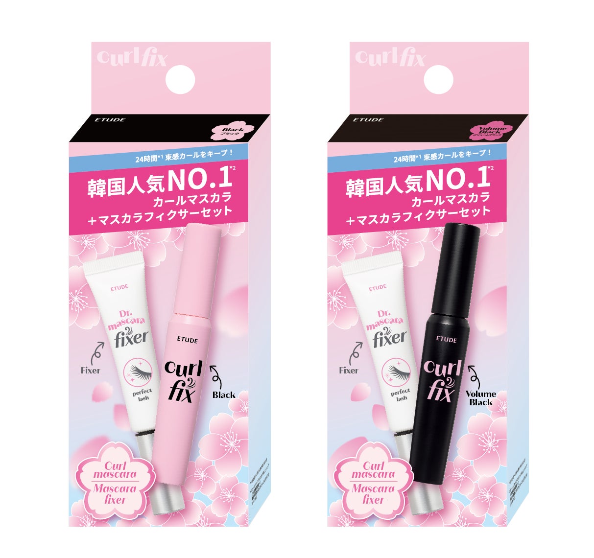 きれいな上向き束感まつ毛に仕上げる「カールフィックスマスカラ」と合わせ使いにおすすめな「マスカラフィクサー」が桜デザインのパッケージで登場!