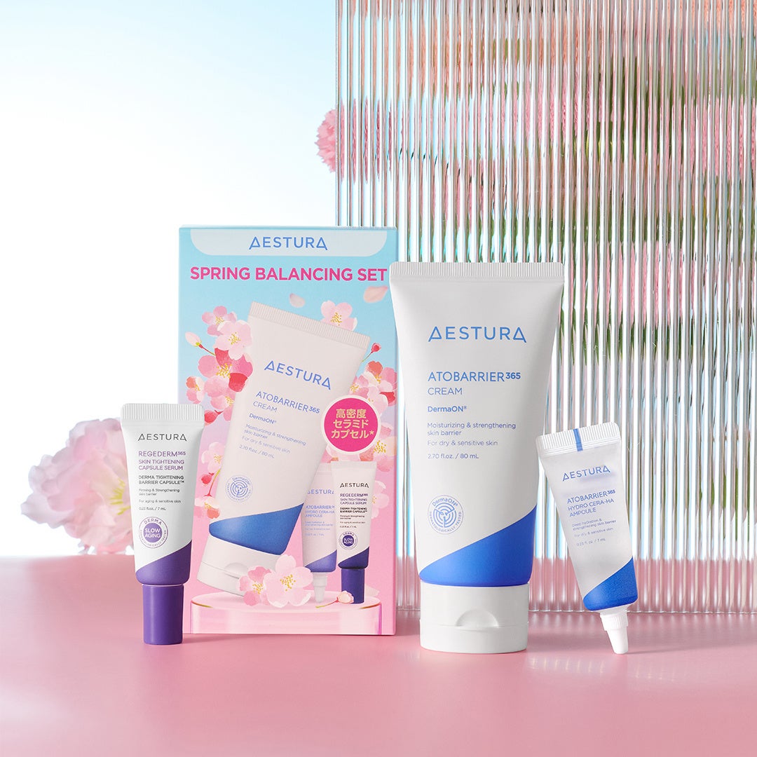 AESTURA(エストラ)を代表するセラミド保湿クリームに新発売の<水分補給&水分密封>の同時ケアでしっかりうるおいを満たす高保水美容液のミニボトルとエイジングサインにアプローチする美容液のミニボトルがセットに。敏感な乾燥肌を高密度セラミドカプセル*¹でうるおいバリアを強化し、120時間*²寝ても覚めても潤った肌に導きます*³。