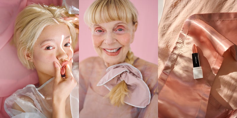 ありのままの体や心を受け入れることができた瞬間を撮影し、セルフラブを応援する花盛友里氏のプロジェクト活動『脱いでみた。』をコンセプトの軸として開発した、裸の心に寄り添うようなピーチベージュカラーは、光を帯びるとイエローラメが大胆にきらめき、顔全体にいきいきとした血色感と立体感を与えます。 天然のマイカ(雲母という天然鉱物を加工したもの)を使用したラメは、滑らかな着け心地で、唇、頬、目元、どこに塗ってもストレスフリーです。