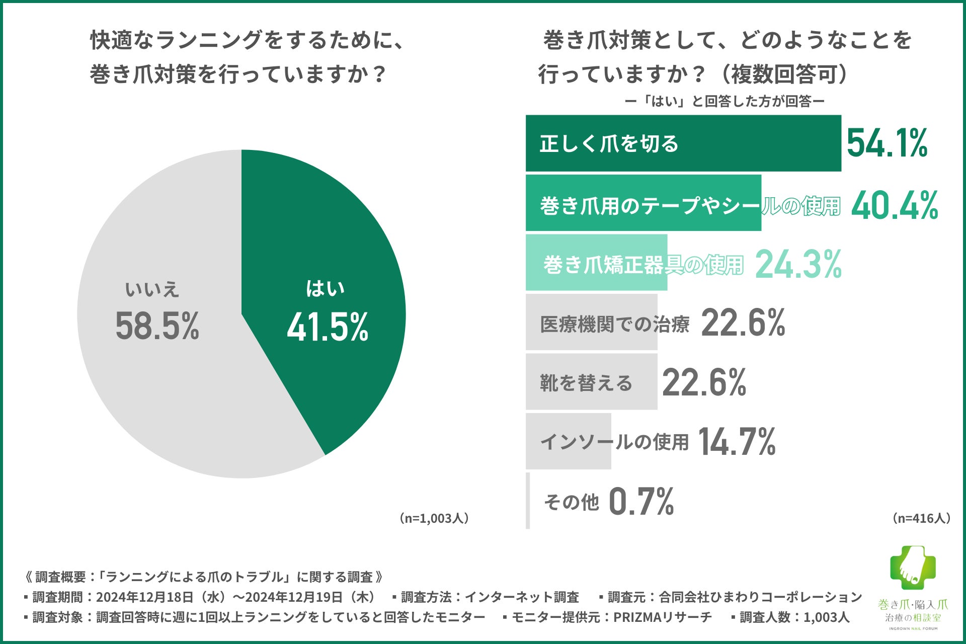 「快適なランニングをするために、巻き爪対策を行っていますか?」と質問したところ、約4割の方が『はい(41.5%)』と回答しました。