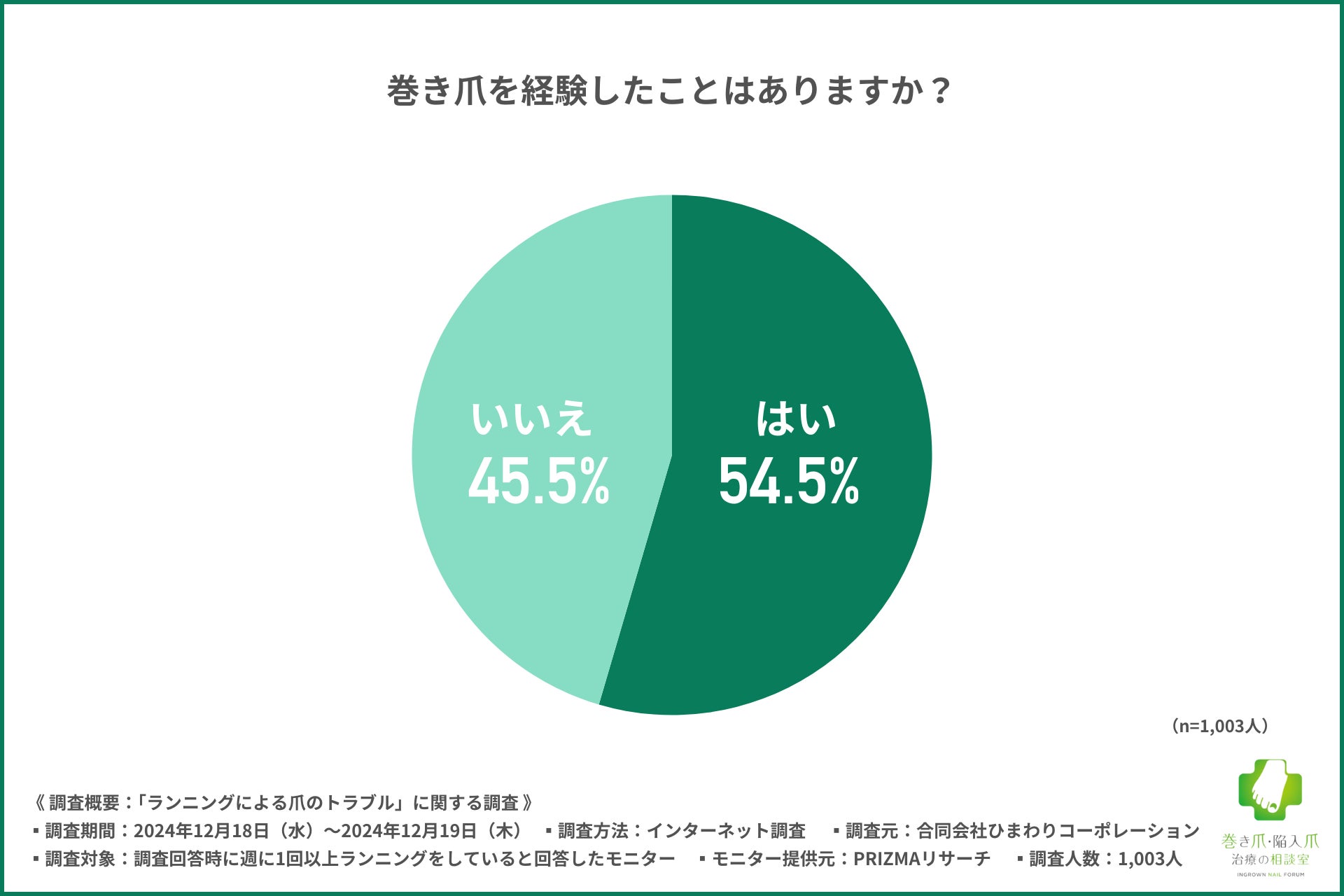 「巻き爪を経験したことはありますか?」と質問したところ、過半数の方が『はい(54.5%)』と回答しました。
