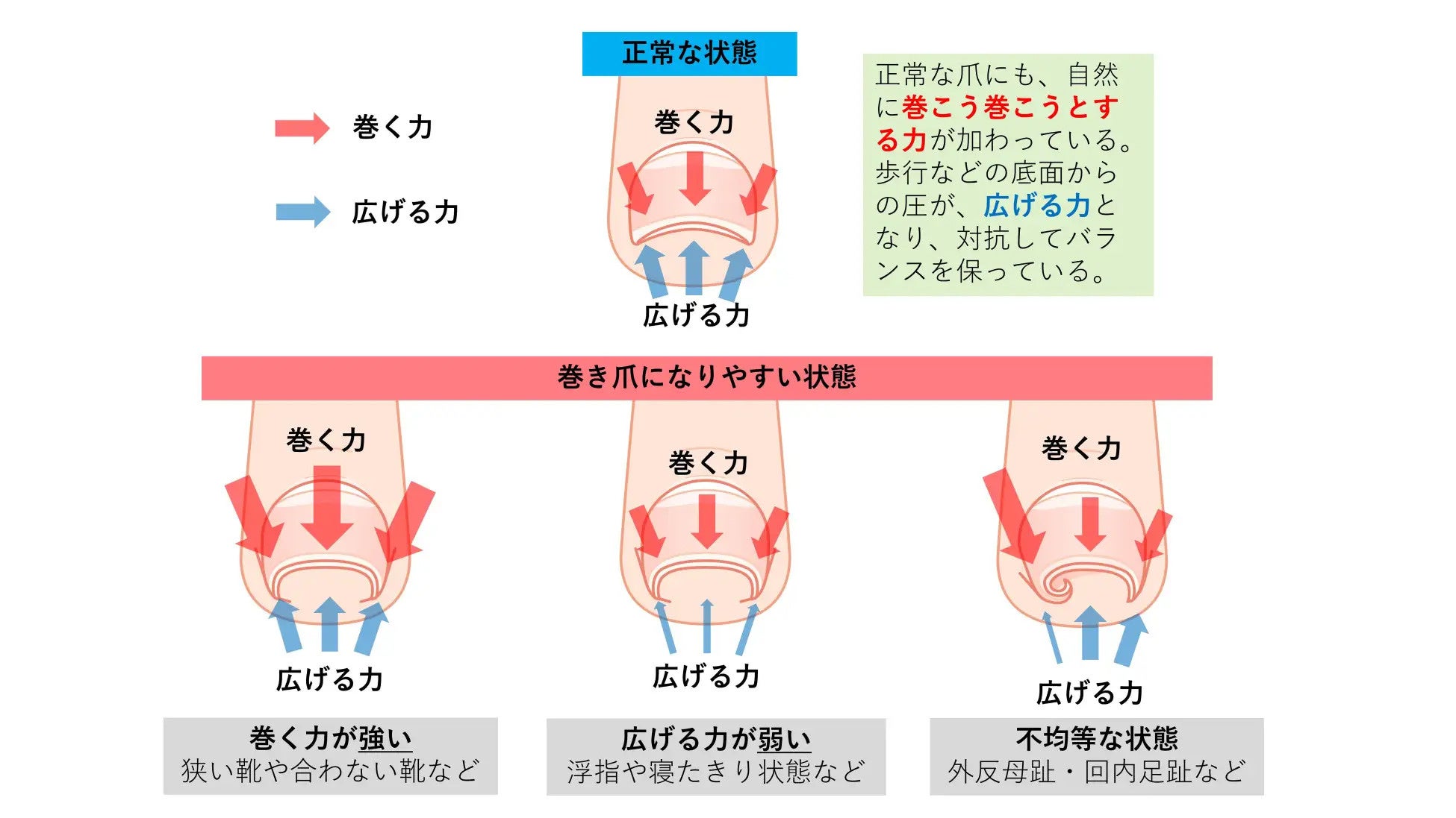 正常な爪も、自然に内側に巻こうとする力が働いています。指を踏みしめることで、下から爪を押し上げる力が働き、巻こうとする力とバランスを保っています。