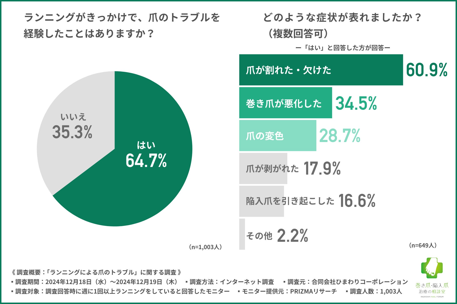 そこで今回、「専門医と学ぶ巻き爪・陥入爪治療の相談室」(https://medical-media.jp/)を運営する合同会社ひまわりコーポレーションは、週に1回以上ランニングをしている方を対象に「ランニングによる爪のトラブル」に関する調査を行いました。
