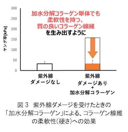 さらに「加水分解コラーゲン」単体でも、紫外線ダメージを受けた際に生み出すコラーゲン線維の柔軟性に対する効果を検証しました。