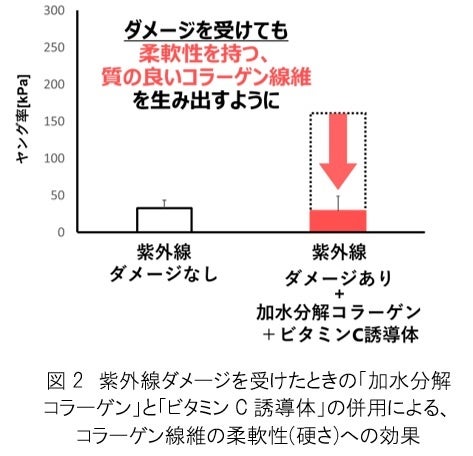 その結果、紫外線ダメージを受けた細胞に対し、「加水分解コラーゲン」と「ビタミンC誘導体」を加えることで、生み出したコラーゲン線維のヤング率が、紫外線ダメージを受けていない場合と同程度になることが分かりました(図2)。