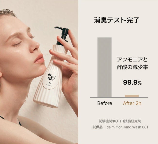 特にハンドウォッシュとシャンプー製品は消臭テストでも優れた性能を示しました。 デミフローハンドウォッシュは大腸菌、黄色ブドウ球菌などの細菌を99.9%減少させる効果があり、手についた臭いを99.9%除去する効果が確認されました。 シャンプーは、頭皮の角質減少、頭皮の保湿量改善、頭皮の鎮静改善などの効果も実証されています。
