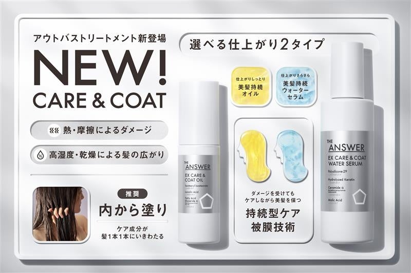 花王株式会社のヘアケア事業変革<新ブランド第二弾>「THE ANSWER(ジアンサー)」は、花王100年の研究からたどり着いた『ジアンサー EXケア&コート オイル』と『ジアンサー EXケア&コート ウォーターセラム』を、2025年3月22日に新発売いたします。ダメージを受けても、ケアしながら美髪を保つ「持続型ケア被膜技術」を採用。根元・毛先、部位ごとにダメージ状態が異なる毛髪に対して、長時間持続する均一な被膜を形成します。ダメージを補修し美髪に導き、熱・乾燥・高湿度などの外部刺激から髪を守ります。