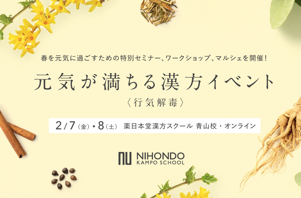 全国に漢方専門店を展開する薬日本堂株式会社(本社:東京都品川区 代表取締役社長 山本雅枝)は、2025年2月7日(金)・8日(土)の2日間、「元気が満ちる 漢方イベント -行気解毒-」を開催いたします。薬膳茶・薬膳酒を作るワークショップ、様々なセミナー、薬膳漢方に関連するショップが集結する和漢マルシェなど、多彩なコンテンツをご用意し、漢方初心者の方も楽しめる内容となっております。