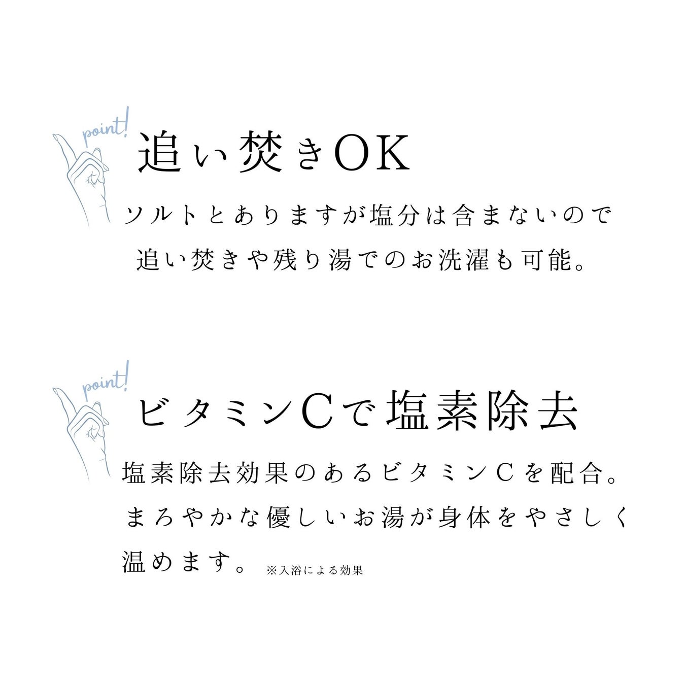 また、アスコルビン酸(ビタミンC)を配合しており、塩素除去効果があるため美肌効果とお湯が柔らかく感じます。
