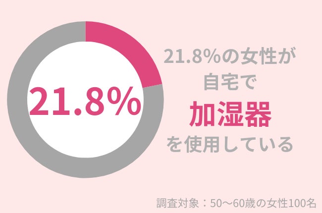 調査の結果、21.8%の50代女性が自宅で加湿器を使用していることがわかりました。加湿器は肌に潤いがない方は、ぜひ活用していただきたいアイテムです。(関連記事:肌に潤いがないのはなぜ?乾燥肌対策で悩みを解決!【潤いを保つ完全ガイド】)
