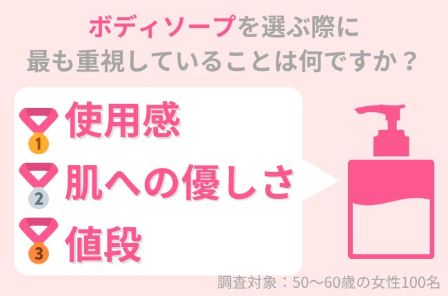 調査の結果、50代女性のうち、最も多くの方が「使用感」(34.7%)を、次に多くの方が「肌への優しさ」(28.7%)を最重要視してボディソープを選んでいることがわかりました。