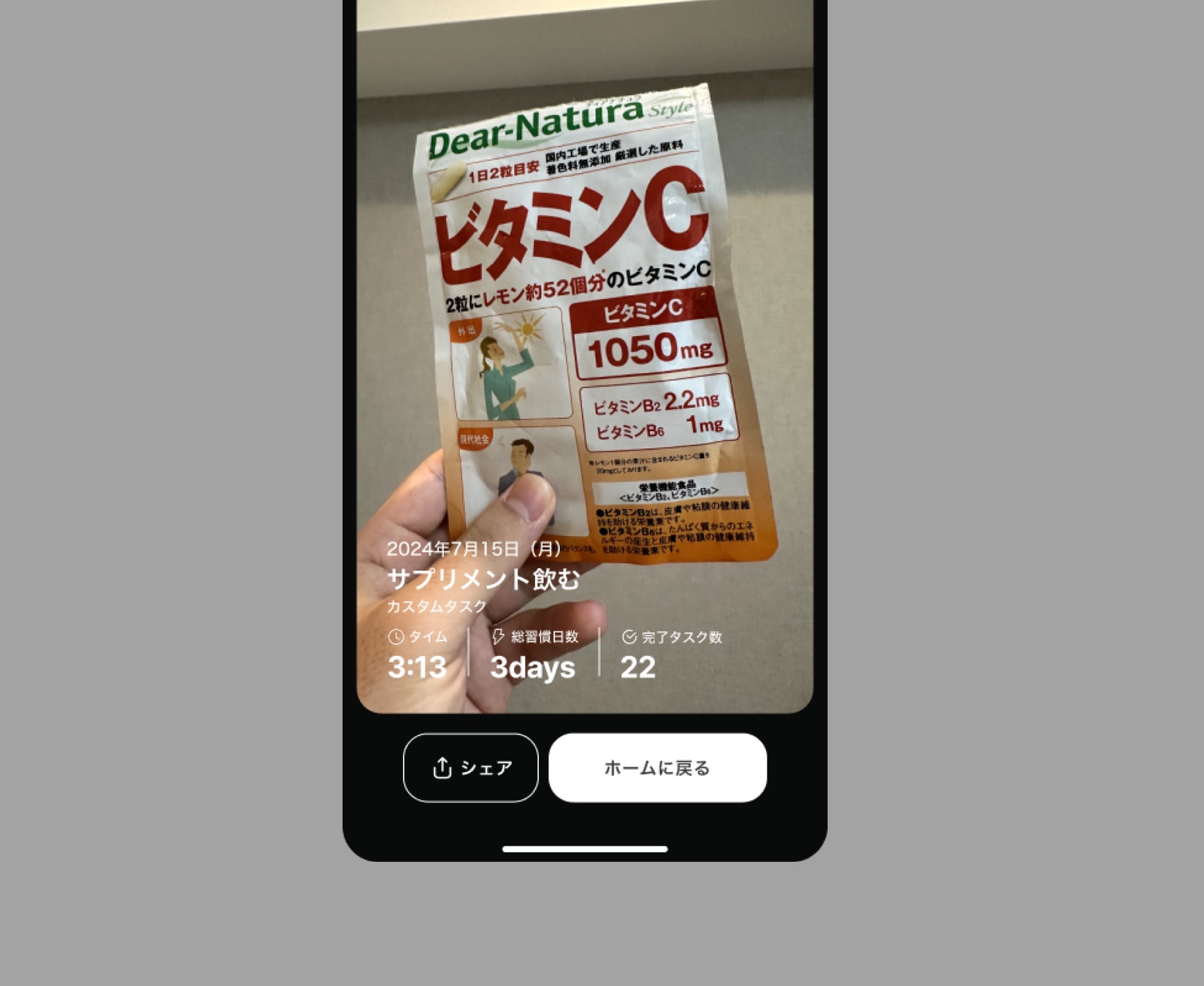 ルーティン完了後は写真で記録できる画面に遷移します。写真には、ルーティン名、習慣日数、完了ルーティン数などが表示され成果が可視化されています。