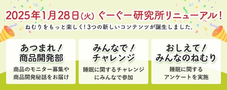リニューアル後の「ぐーぐー研究所」では、これまでの機能を進化させ、より使いやすく、広がりのあるコミュニケーションの場を実現。『あつまれ!商品研究部』『みんなで!チャレンジ』『おしえて!みんなのねむり』という新しい名称のもと、睡眠に関する情報交換をより豊かな形で楽しめるサイトに生まれ変わりました。