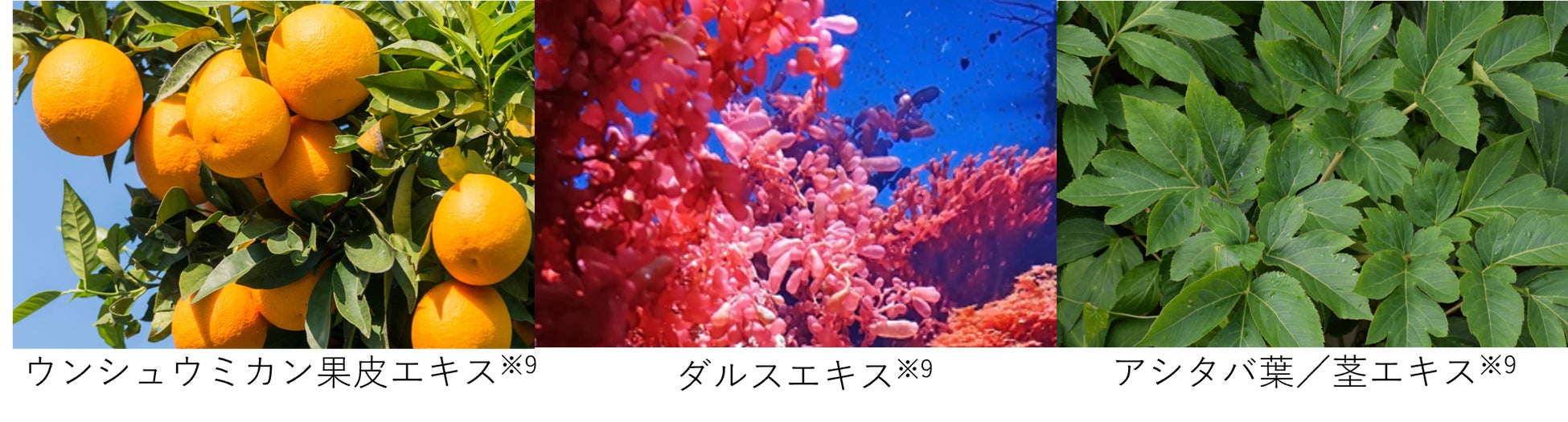 エアコンによる冷えや、紫外線などの外的ダメージを受ける夏は、肌も乾燥しがち。うるおいの「巡り※7」をサポートするウンシュウミカン果皮エキス※8、ダルスエキス※8、アシタバ葉/茎エキス※8を3アイテムに共通配合し、ゆらぎやすい夏の肌をみずみずしくケアします。