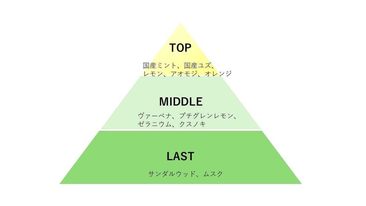 清涼感あふれる国産ミント精油※2-4と爽やかさの中にほんのり苦みを感じる国産ユズ精油※6を基調に、人気のヴァーベナをブレンドしたリフレッシュシトラスの香り。